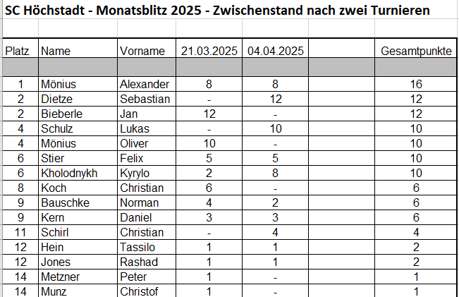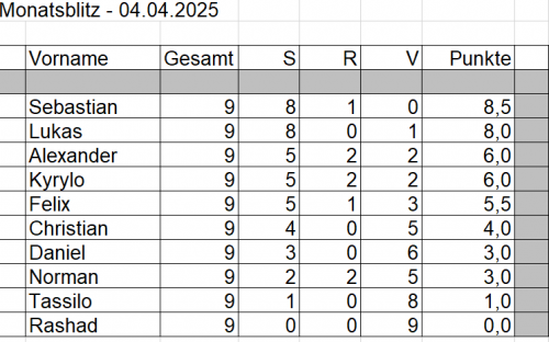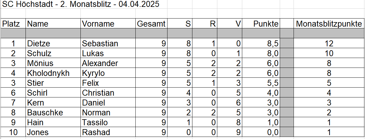Das zweite Monatsblitzturnier 2025 fand am Freitag, den 04.04.2025 statt. Sieger wurde Sebastian Dietze, der bereits in der ersten Runde seinen größten Konkurrenten Lukas Schulz bezwingen konnte und anschließend nur noch gegen Alexander Mönius remisierte. Lukas Schulz kam auf Platz 2. Die Plätze 3 und 4 teilten sich punkt- und wertungsgleich Alexander Mönius und Kyrylo Kholodnykh. Die Gesamttabelle führt Alexander Mönius vor Jan Biebertle und Sebastian Dietze an. Das nächstes Monatsblitz findet am 16.05.2025 statt.