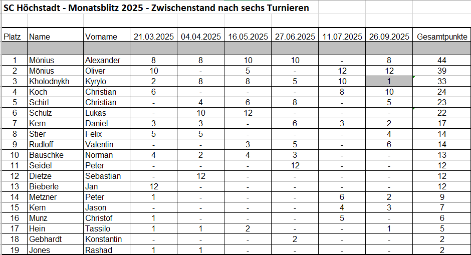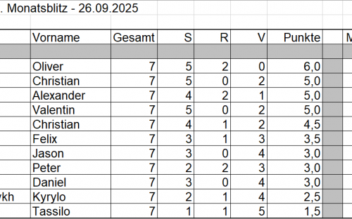 Das sechste Monatsblitzturnier des Jahres 2025 fand am Freitag, den 26.09.2025 statt. 11 Teilnehmer spielten ein Schweizer-System Blitzturnier mit sieben Runden.