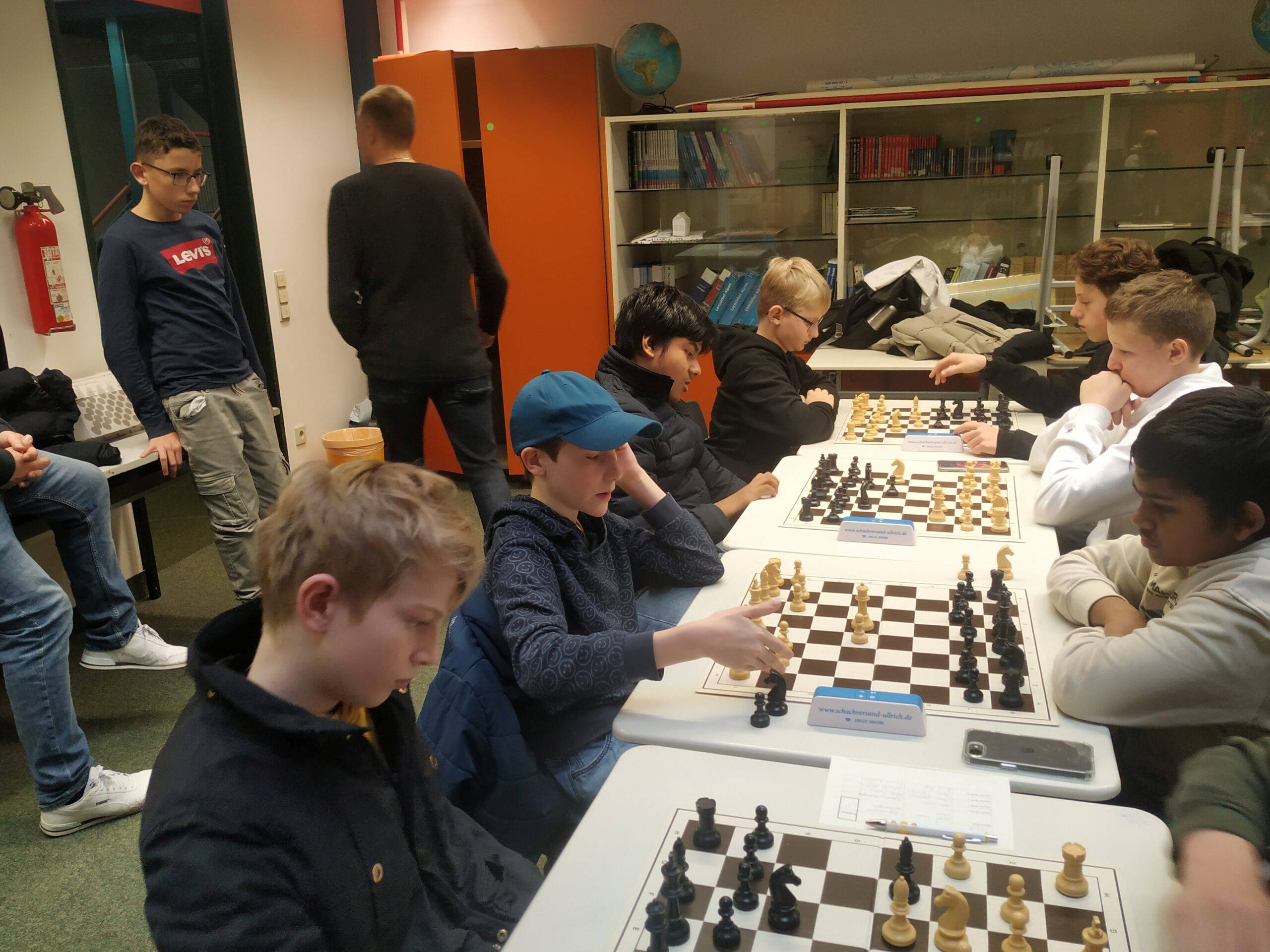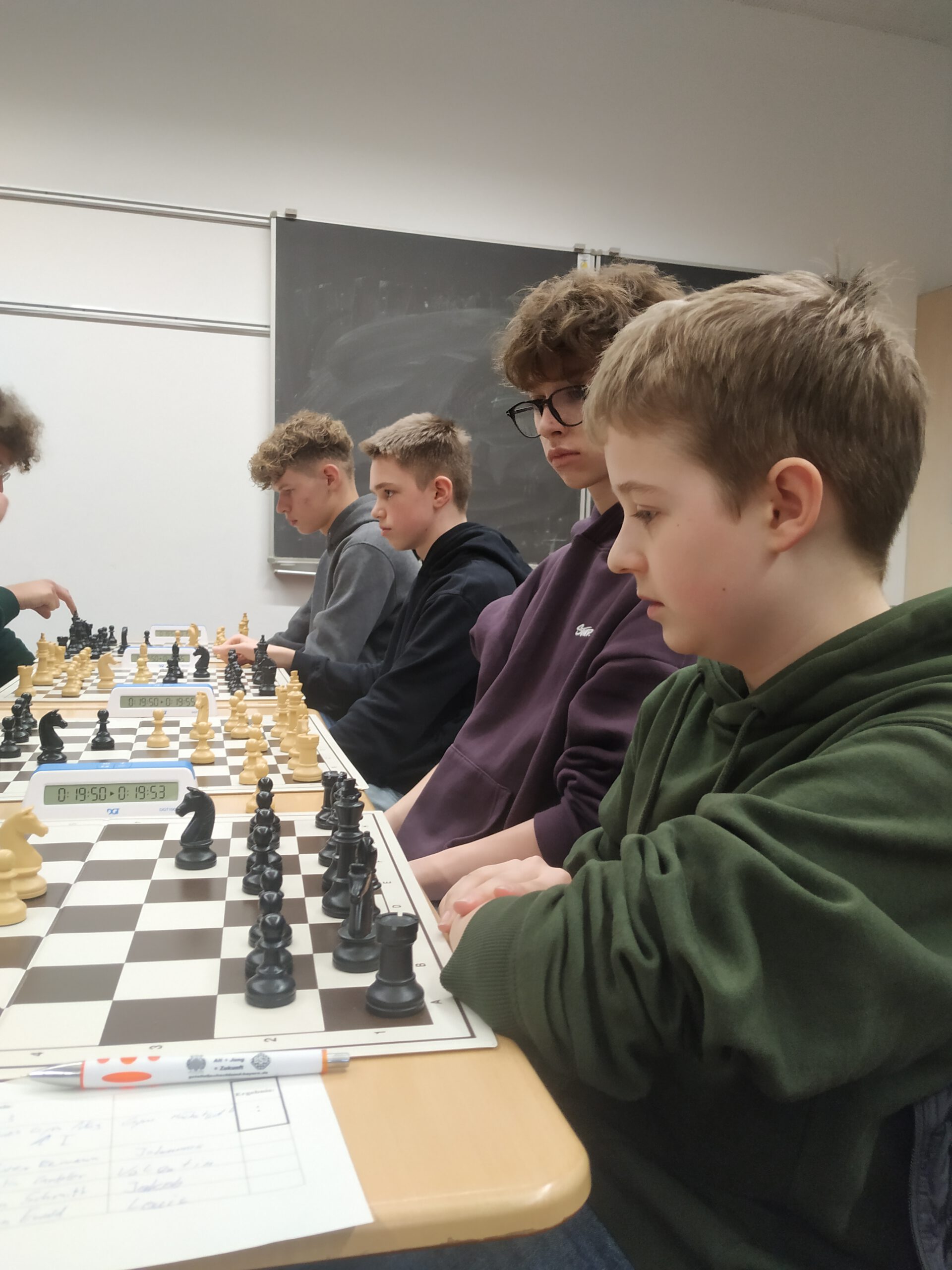 Für das Gymnasium starteten in der Wettkampfklasse 2 Johannes Laubinger, Valentin Rudloff, Jakob Gugel und Louis Oeser und in der Wettkampfklasse 3 Paul Schwarzmann, Adrien Marois, Shourjo Mitra, Jonas Kallies und Jonas Beinlich. Es wurden 7 Runden Schnellschachpartien zu je 20 Minuten Bedenkzeit gespielt. Das Teilnehmerfeld war mit sehr guten Schachspielern aus der Spitze Mittelfrankens und sogar Bayerns besetzt, so dass mitunter jeder kleinste Fehler bestraft wurde und zum Verlust einer Partie führen konnte. Unsere Teams kämpften wacker und konnten gut mithalten, mussten sich aber dennoch einigen besonders starken Mannschaften geschlagen geben. Am Ende konnte sich unser Team in WK 2 mit 4 Siegen, einem Unentschieden und zwei Niederlagen den fünften Platz von den 18 teilnehmenden Mannschaften sichern, in WK 3 schafften wir mit zwei Siegen, drei Unentschieden und zwei Niederlagen einen guten siebten Platz im Mittelfeld der 14 Mannschaften.