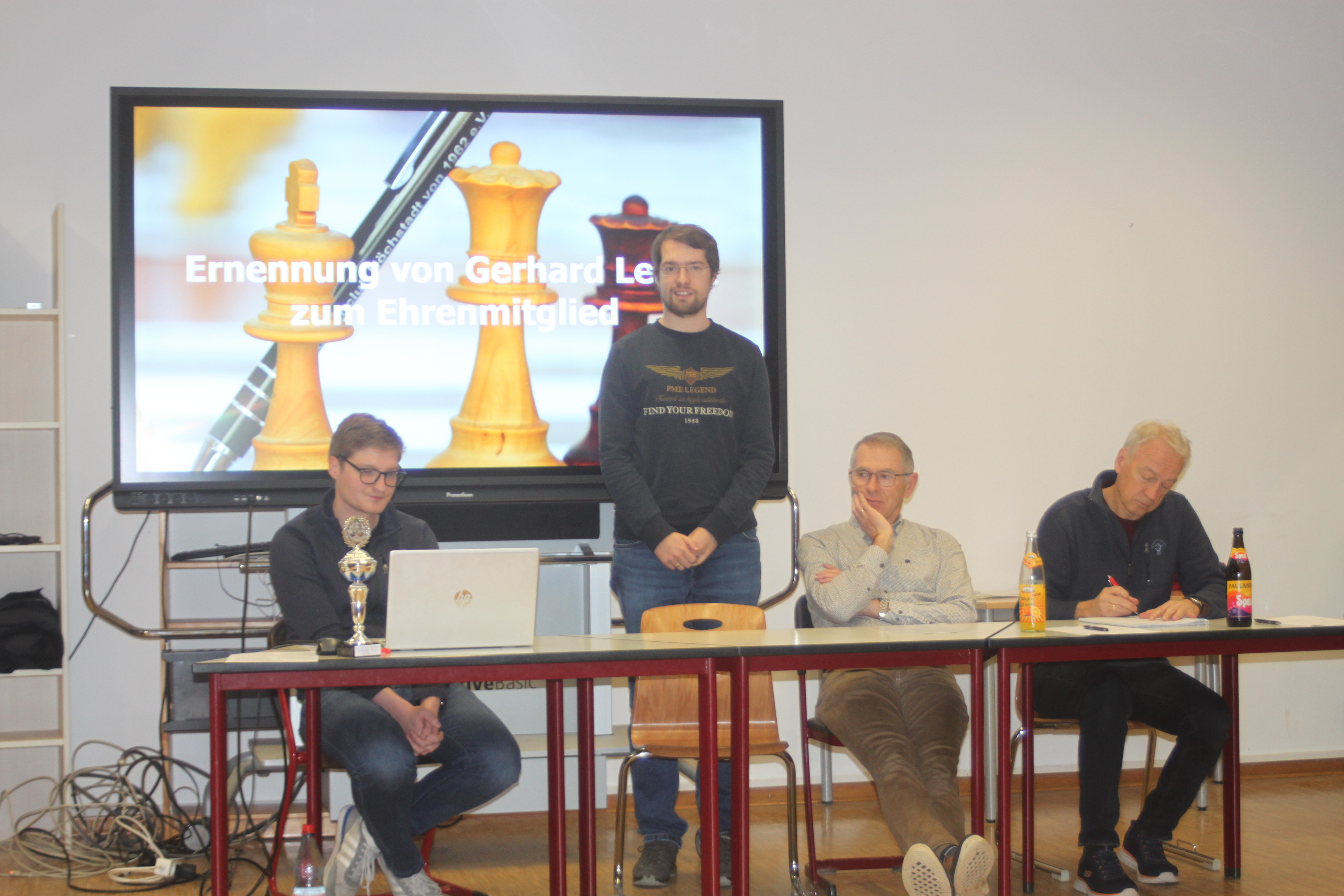 Ein besonderer Teil des Abends war den Schachfreunden Gerhard Leicht und Wolfgang Paulini gewidmet, welche für ihre langjährige und herausragende Arbeit in verschiedenen Positionen im SC Höchstadt mit der Ehrenmitgliedschaft ausgezeichnet wurden. Besonders im Bezug auf Gerhard Leicht ist dies erfreulich, da es ihm im Verlaufe seiner Schach-Karriere gelang, viele der heute aktiven Mitglieder mit seiner typisch-hemdsärmlichen und doch so herzlichen Art zu formen. Gerade die damalige Jugend hat ihm viel zu verdanken. Wolfgang Paulini ist bestrebt, auch noch länger dem Verein zur Verfügung zu stehen und nahm die Ehrung voller Freude entgegen.