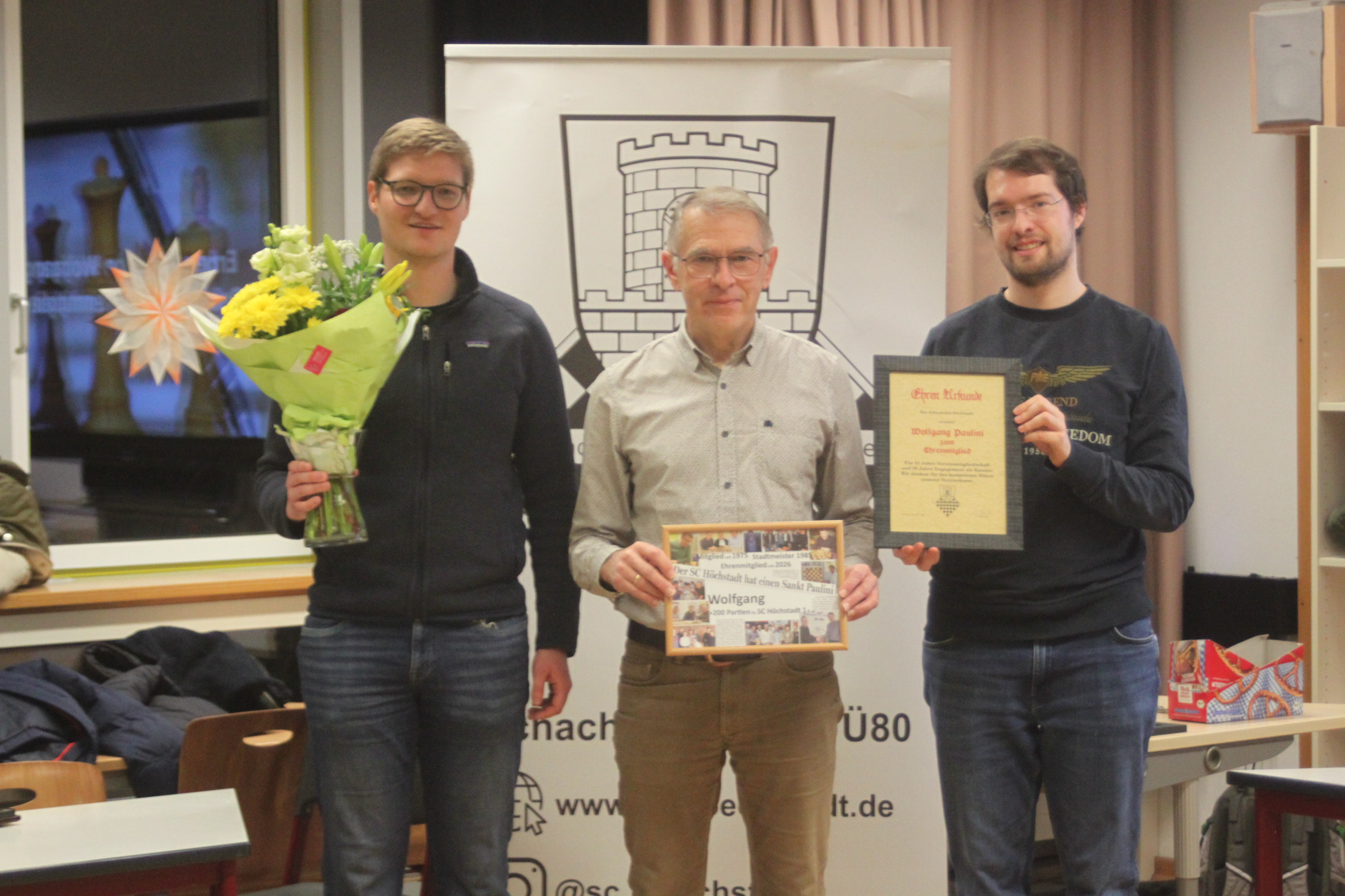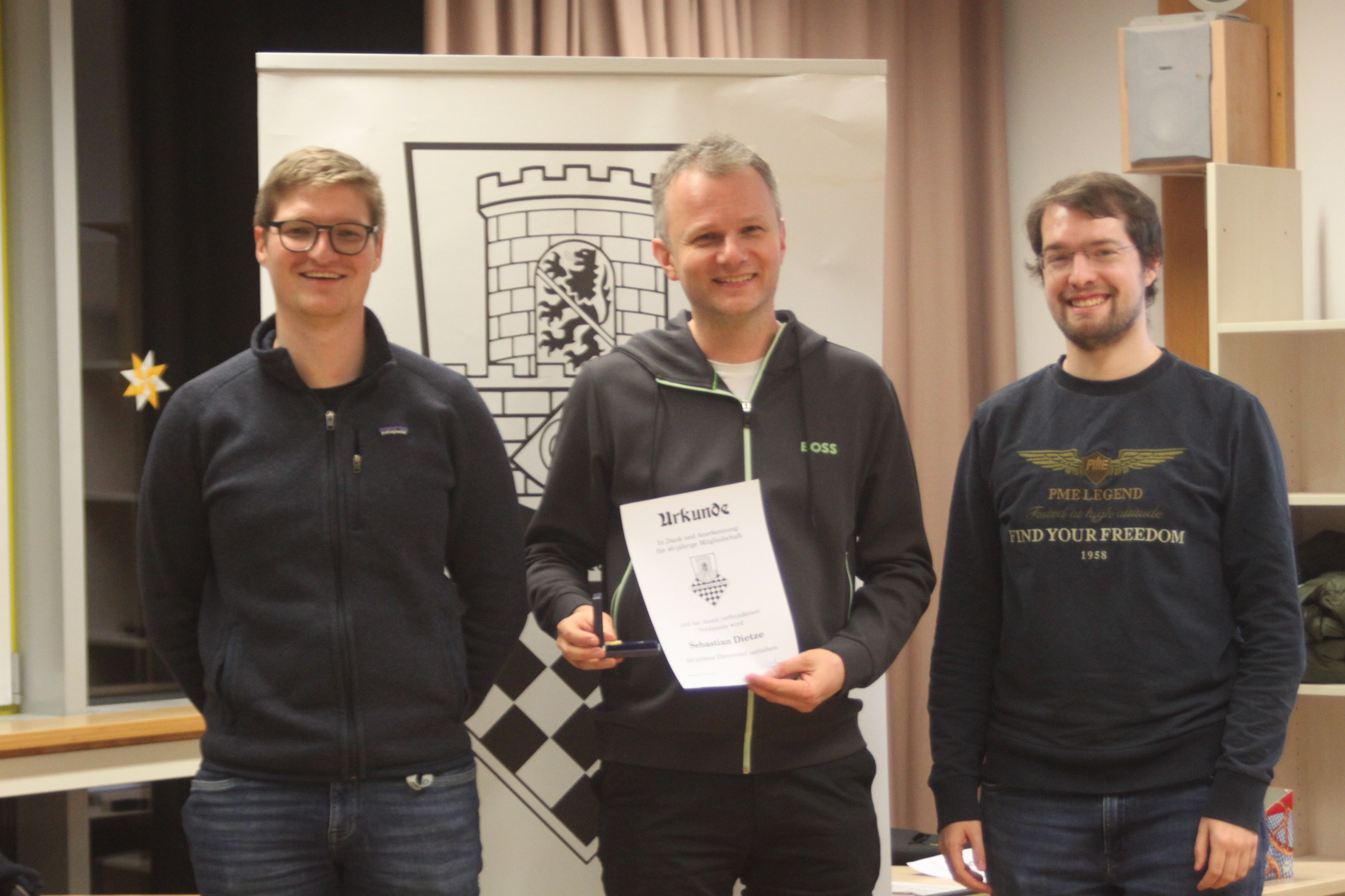 Sieger der Monatsblitz-Turniere im Jahr 2025 wurde Oliver Mönius vor seinem Bruder Alexander Mönius. Er empfing für diese Leistung einen Pokal und eine kleine Nascherei. Wohl bekomm's! Des Weiteren wurden viele Mitglieder für ihre langjährige Mitgliedschaft geehrt, leider waren einige an diesem Abend nicht persönlich zugegen, um die Auszeichnung in Form einer Ehrennadel selbst entgegenzunehmen. Sebastian Dietze, welcher besonders durch sein Engagement für die Schachzeitung und als Top-Spieler der 1. Mannschaft für besondere Gelegenheiten glänzt, war jedoch extra aus dem Saarland angereist, um die Auszeichnung zu empfangen und um die 1. Mannschaft beim Spieltag am kommenden Sonntag zu unterstützen.