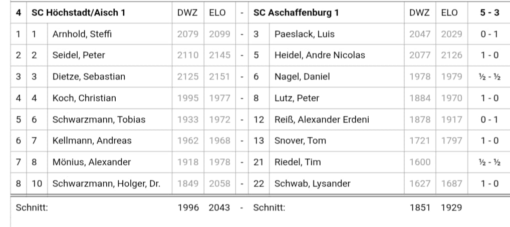 Knapp 100 DWZ-Punkte mehr brachten die Höchstadter im Heimspiel in der Ritter-von-Spix Mittelschule ans Brett und spielten diesen Vorteil auch konsequent aus. Aus dem Saarland war extra Top-Spieler Sebastian Dietze angereist, um nach Steffi Arnhold (Brett 1) und Peter Seidel (Brett 2) das 3. Brett zu besetzen. Während Arnhold sich zwar gegen Luis Paeslack geschlagen geben musste, konnte Peter Seidel punkten und Sebastian Dietze ein Unentschieden ausfechten. Die zweifellos spannendste Partie mit fast 5,5 h spielte Christian Koch, doch die Ausdauer des Höchstadters, dessen Gegner bereits in der Eröffnung nicht konsequent spielte wurde belohnt. Zwar gelang es ihm nicht, wie gewünscht einen Damentausch zu erzwingen, schaffte es jedoch nach 98 Zügen seinen Gegner zu überrumpeln.