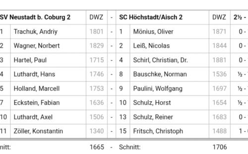 Ebenfalls sehr erfreulich war der Sieg der 2. Mannschaft des SC Höchstadt auswärts zu Gast bei der SV Neustadt b. Coburg 2. Nachdem in den vergangenen Begegnungen in der Bezirksliga West nicht die erwünschten Ergebnisse erzielt werden konnten, war das Ergebnis des vergangenen Spieltages höchst erfreulich. Mit 2,5 : 5,5 schlugen sie ihre Gegner und trugen nur eine Verlustpartie davon.