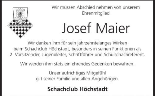 Mit Josef Maier verliert der Schachclub Höchstadt nicht nur sein Ehrenmitglied, sondern auch einen langjährigen Funktionär und einen engagierten Schachspieler.