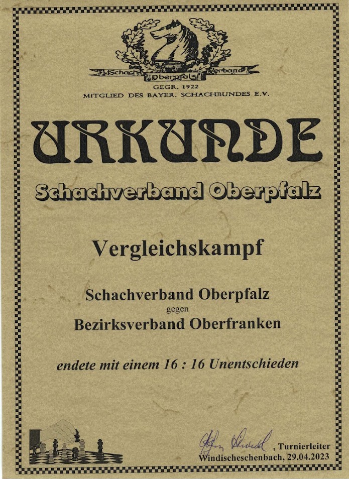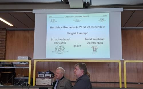 Der ausrichtende SC Windischeschenbach 1957 e.V. scheute keine Mühen und Kosten um einen würdigen Rahmen für den Schachvergleichskampf zwischen der Oberpfalz und Oberfranken zu bieten. Anlässlich des 100-jährigen Jubiläums des Schachverbands Oberpfalz (SVO) im Jahre 2022 und des Bezirksverbands Oberfranken (BVO) 2021, haben sich beide Verbände in einem Vergleichskampf gegeneinander gemessen und dieses Jubiläum miteinander gebührend gefeiert. Übrigens: Der letzte Vergleichskampf fand vor 57 Jahren (1966) statt. Damals gewann Oberfranken mit 24-16 Punkten.