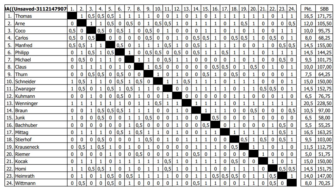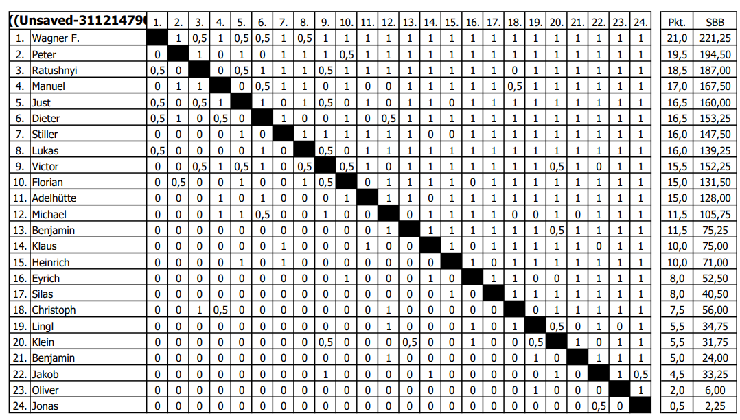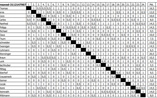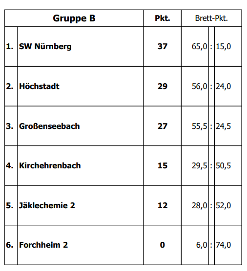 Der Schachclub Höchstadt startete zum ersten Mal bei diesem Turnier und trat mit FM Florian Ott, FM Lukas Schulz, Peter Seidel und Michael Brunsch in der Gruppe B an. Neue Mannschaften müssen immer in der Gruppe B anfangen und können sich als Sieger für die Gruppe A qualifizieren. Der letzte der Gruppe A muss absteigen. Bereits in der ersten Runde musste der Schachclub Höchstadt gegen den späteren Sieger der Gruppe B Schwarz-Weiß Nürnberg spielen. Hier kam man überraschen schnell unter die Räder und verlor hoch. Erst im Laufe des Turniers konnte man sich wieder erholen und erkämpfte zu mindestens noch den 2. Platz. Bei der Siegerehrung erhielt der Schachclub Höchstadt ein 15l Fass „Annafest Bier“ und freut sich schon auf das Annafestblitzturnier 2025.