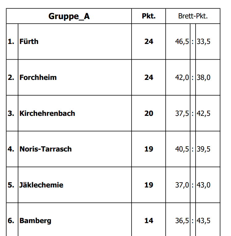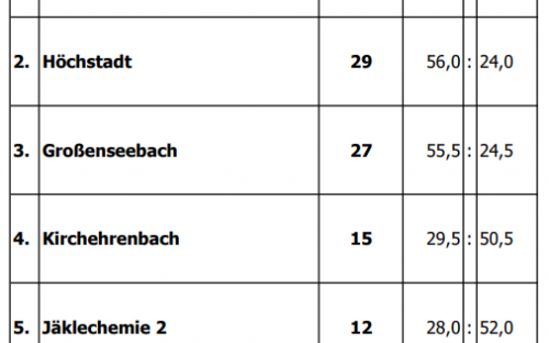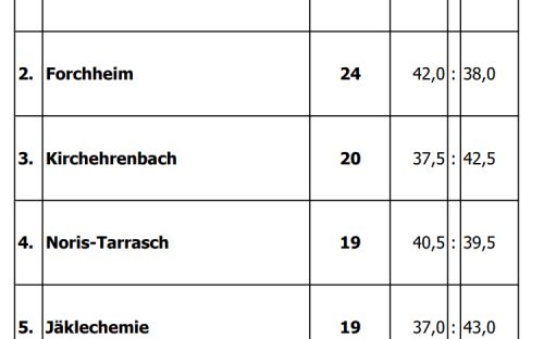 In Gruppe A gewann die SG Fürth in einem Herzschlagfinale gegen die Gastgeber aus Forchheim, die zuvor ihre Führung gegen Jäklechemie aus der Hand gaben. In der Gruppe B siegte Schwarz-Weiß Nürnberg mit einem komfortablen Vorsprung vor dem SC Höchstadt/Aisch. Die Einzelwertung ge-wann Philipp Wenninger (Jäklechemie) in Gruppe A und Florian Wagner (SW Nürnberg) in Gruppe B.
