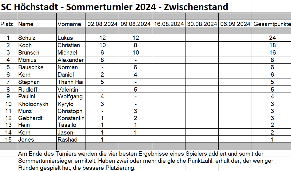 Sommerturnier – Runde 2 – 09.08.2024 Lukas Schulz gewinnt auch 2. Turnier