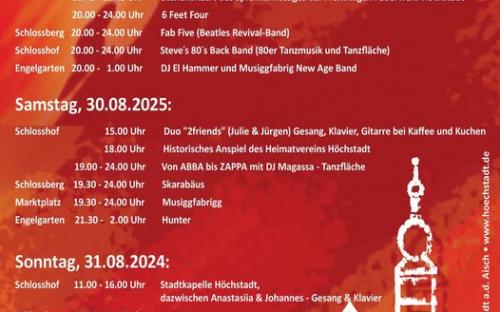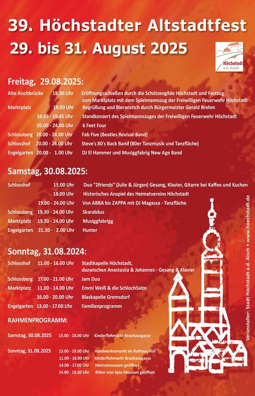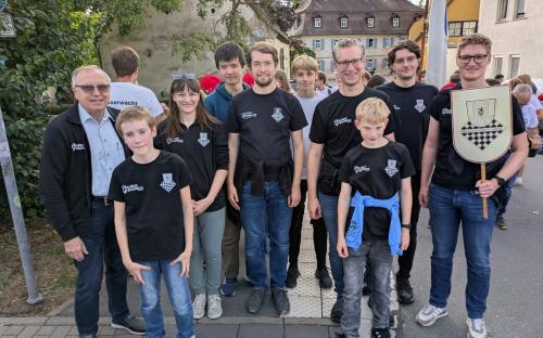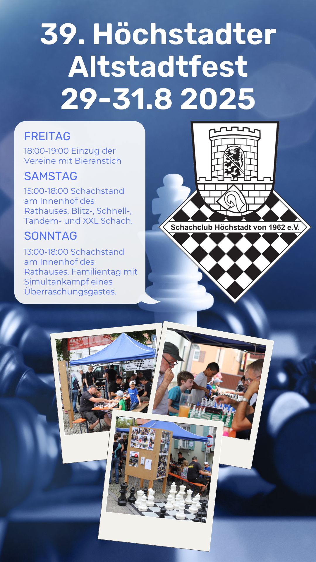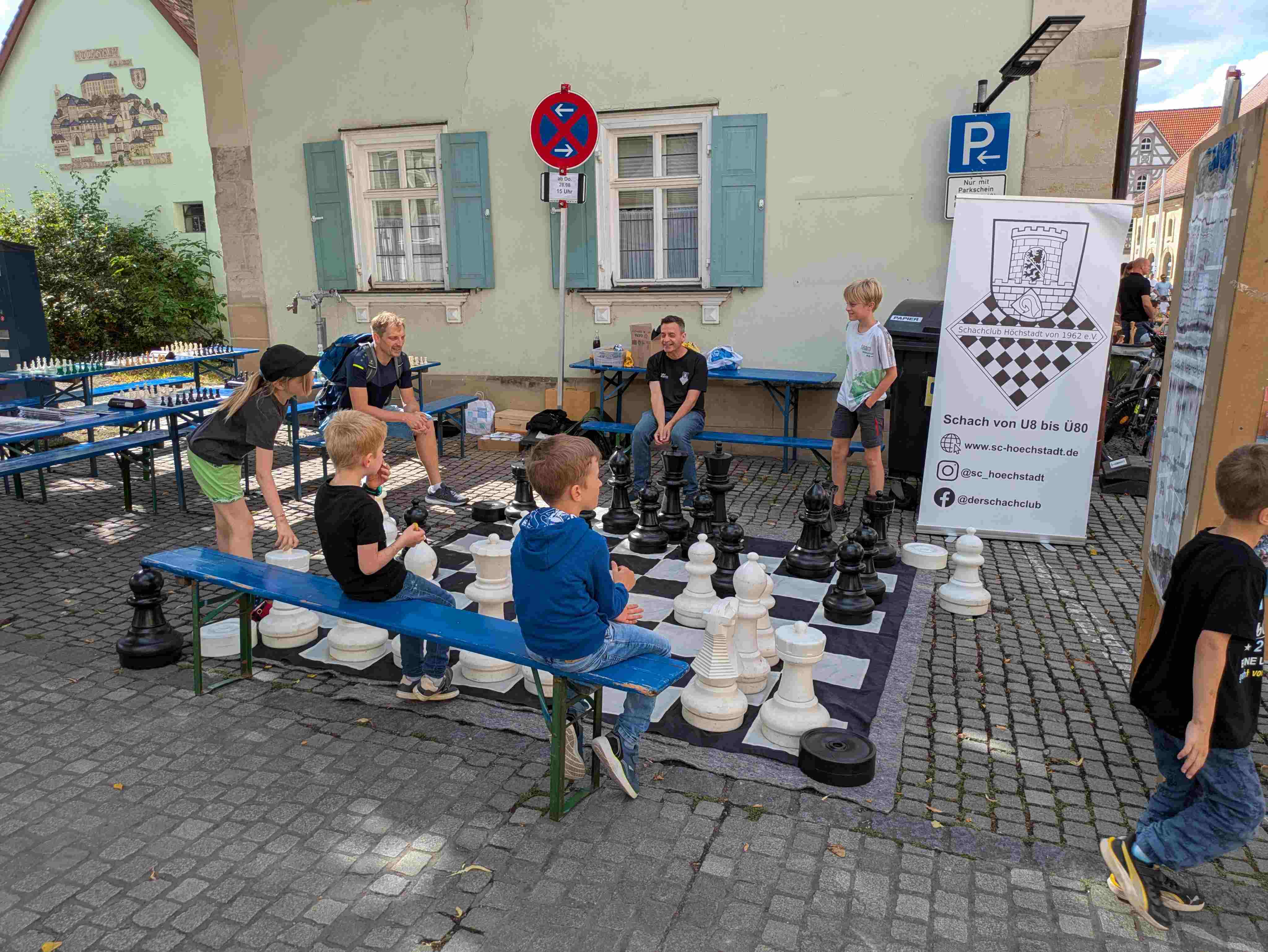 Das 39. Höchstadter Altstadtfest lockte am letzten Augustwochenende wieder, bei überraschend gutem Wetter, Gäste aus Nah und Fern an die Aisch. Es war auch in diesem Jahr eine große Party, mit viel Musik, Kinderflohmarkt sowie Speis & Trank. Wir Schachspieler sind von Anfang an dabei und punkteten erneut mit dem königlichen Spiel. Aber von Anfang an: Am Freitag fand das traditionelle Böllerschießen von der neuen Aischbrücke statt. Anschließend zogen die Vereine, angeführt vom Spielmannszug der freiwilligen Feuerwehr Höchstadt, durch die Altstadt in das Festzelt am Marktplatz.