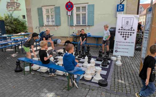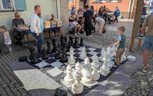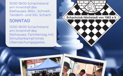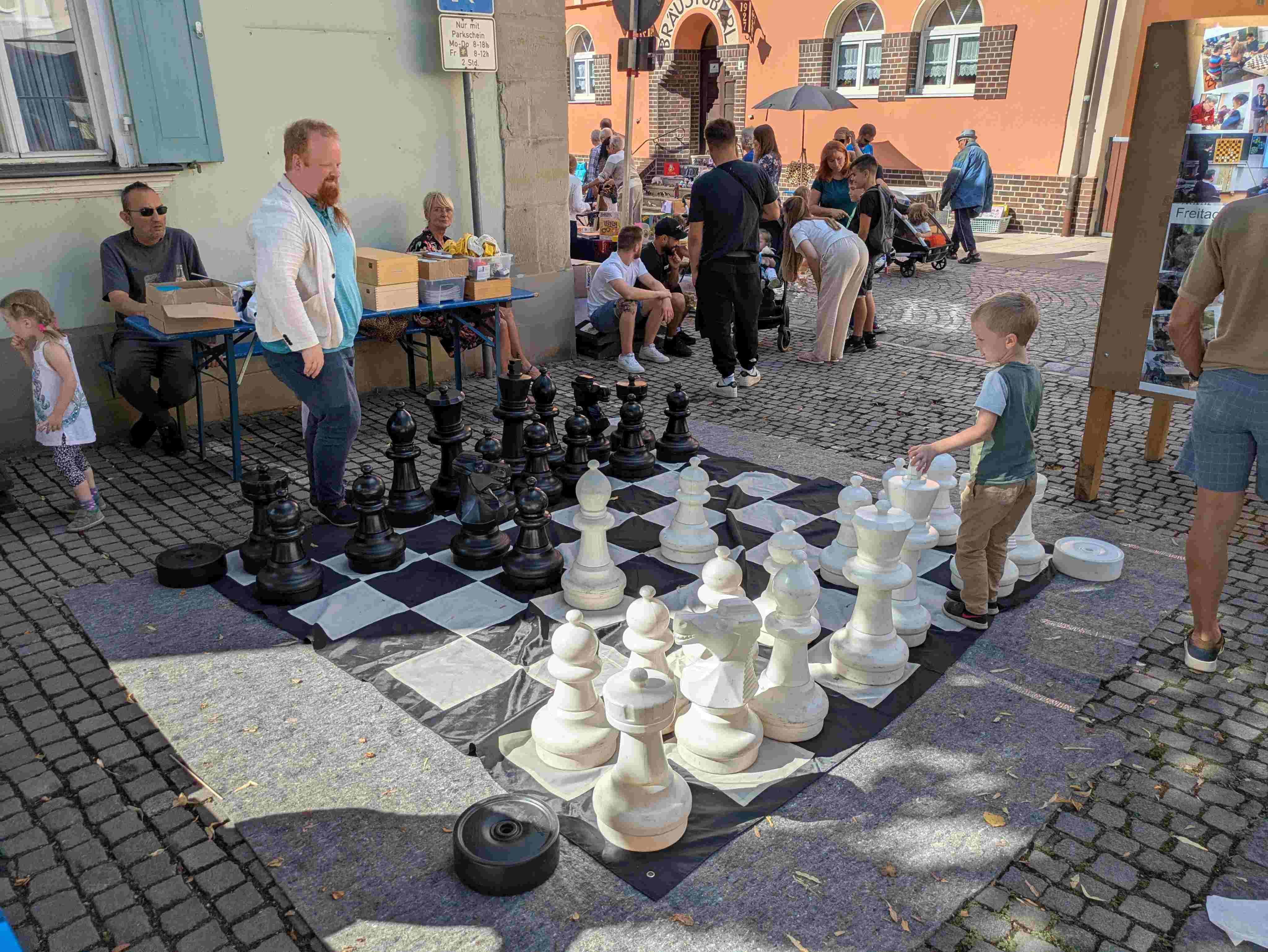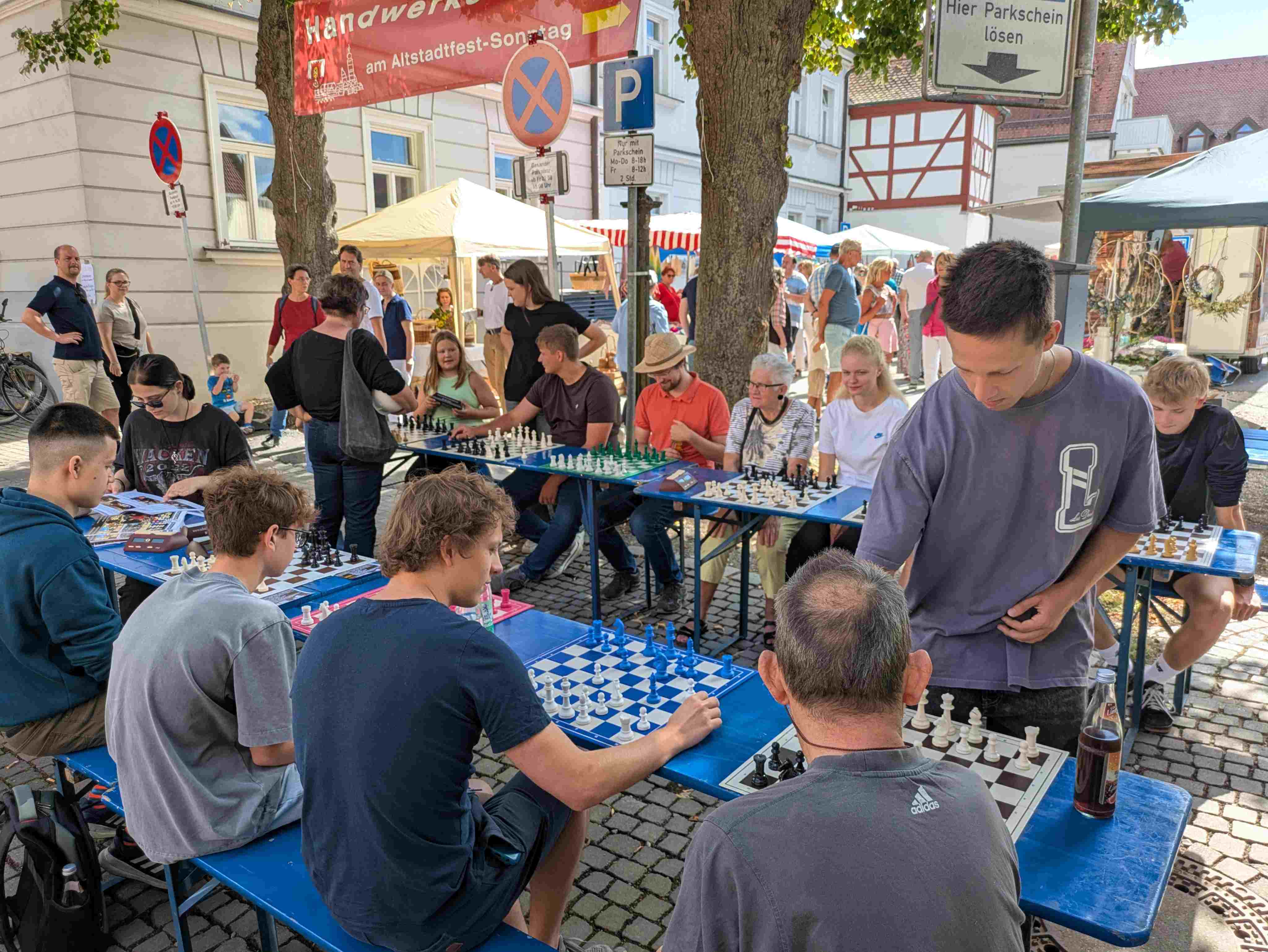 Am Samstag und Sonntag war der Schachclub wieder neben dem Rathaus mit seinem großen Schachstand präsent. Zwischen Handwerkerhof und Kinderflohmarkt konnte der Schachclub wieder viele Gäste begrüßen. Das Highlight war am Sonntag eine Simultanvorstellung von Jan Bieberle am laufenden Band.