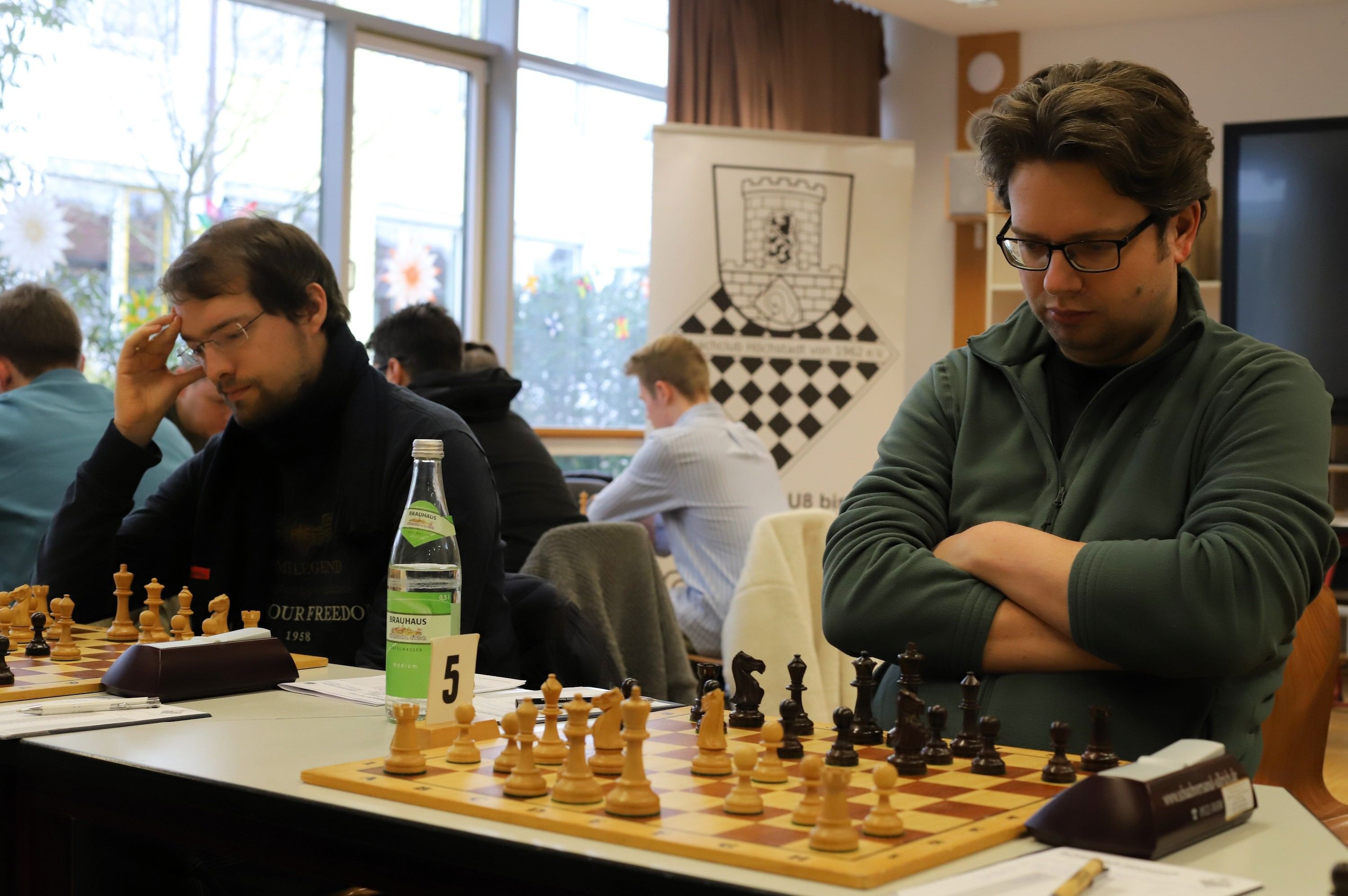 Der Gegner von Andreas Kellmann wies eine geschwächte Stellung während des gesamten Spieles auf und gab dann im Endspiel einen zweiten Bauern drein, so dass es Kellmann gelang, die Kontrolle über seine Partie zu behalten. Obgleich er konstant verteidigen musste, gelang es Alexander Mönius zugleich einen Angriff auf die Königsstellung des Aschaffenburgers Tim Riedel zu starten und sich so eine Atempause zu erringen. Da aufgrund der Komplexität seiner Stellung auf beiden Seiten Vorteile nicht optimal genutzt werden konnten, kam es auch hier zum Remis.